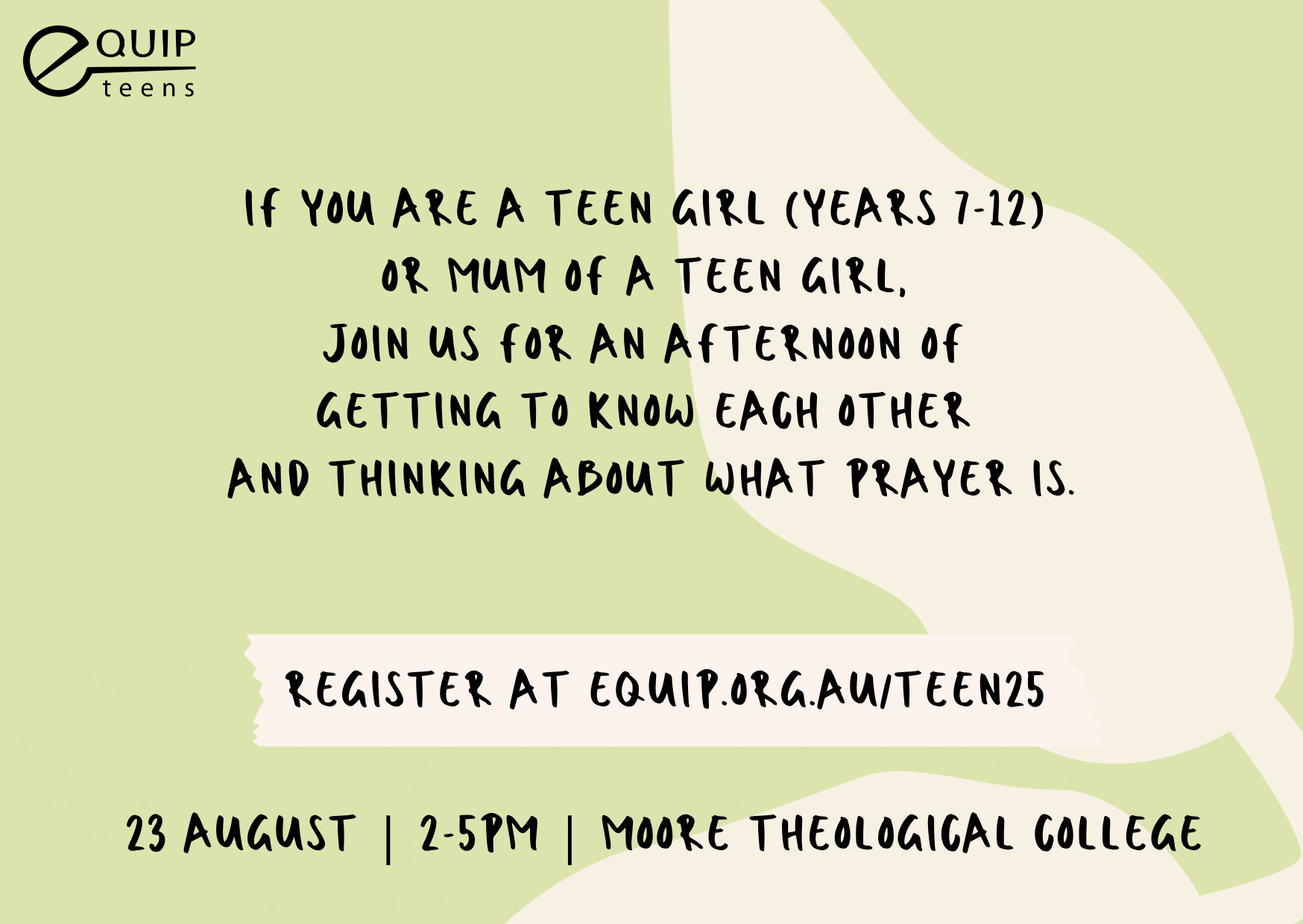Teen girls in Years 7-12 are invited to an afternoon of getting to know others and exploring the topic of prayer.